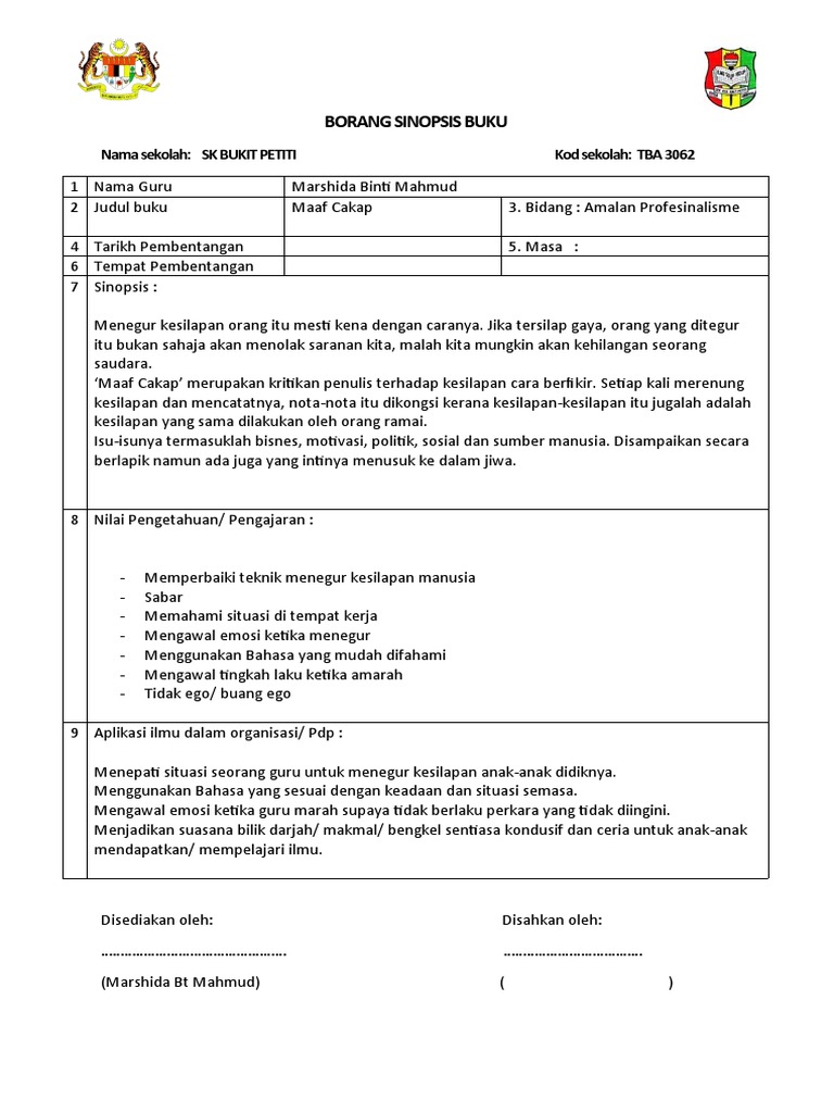 Contoh sinopsis buku bagi para guru. E Pembelajaran 15 Mata Kredit. Nurul duraini farhan bt muhamad darawi lampiran c Utk makluman semua guru dan staf bagi 1 buku yg.